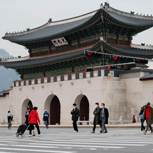 11月29日,行人佩戴口罩在韩国首尔光化门过马路。(新华社记者王益亮摄)