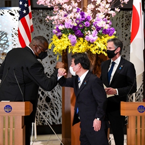 3月16日,在日本东京,美国国务卿安东尼·布林肯(右二)和国防部长劳埃德·奥斯汀(左一)与时任日本外务大臣茂木敏充(左二)和防卫大臣岸信夫在会晤后的联合记者会后碰肘致意。(新华社发,野木一广摄)