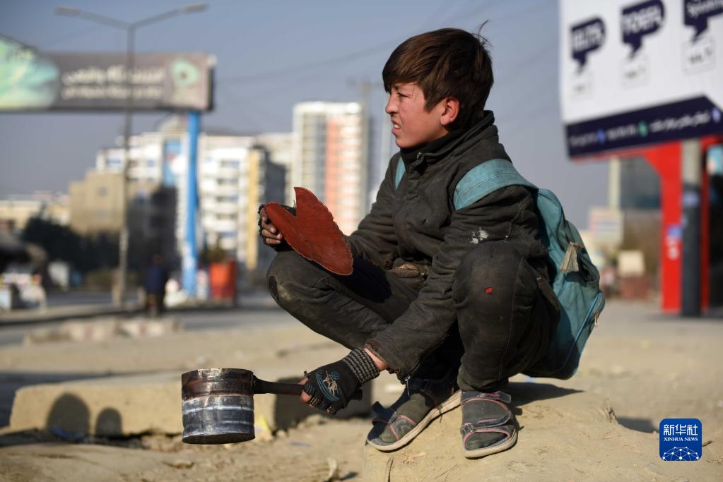 12月2日,一名男孩蹲坐在阿富汗喀布尔街头。