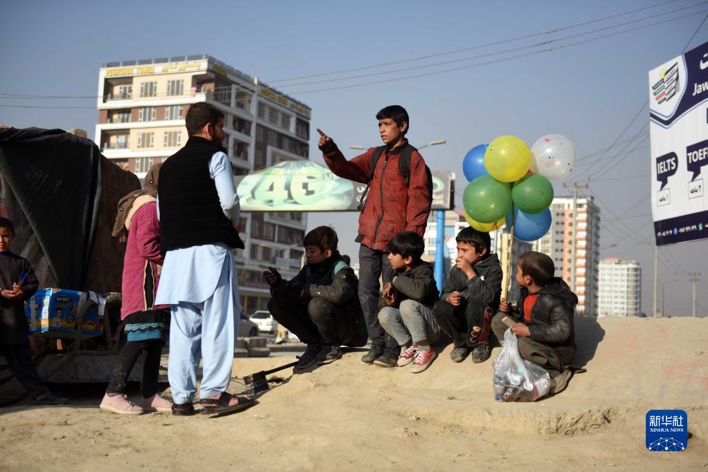 12月2日,几名儿童坐在阿富汗喀布尔街头。