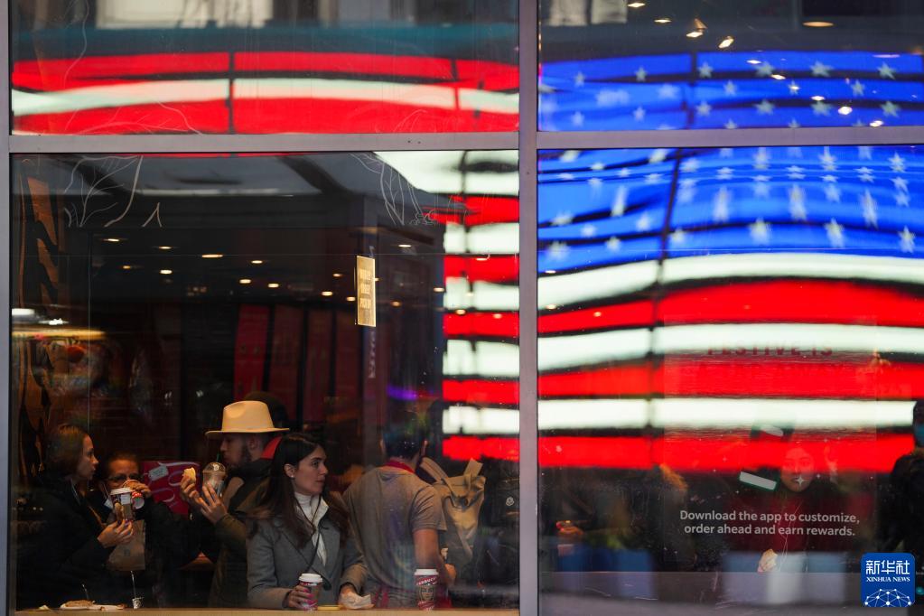 12月7日,人们在美国纽约时报广场上的一家咖啡店消费。新华社记者 王迎 摄
