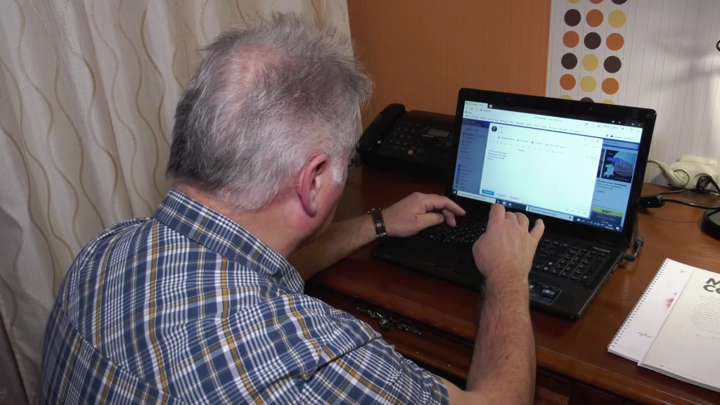 弗拉基米尔·沃罗比约夫在电脑上写下歌曲《北京》的歌词。(视频截图)