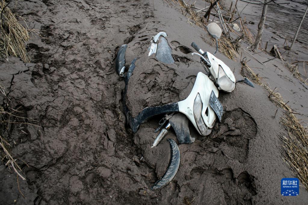 12月7日,在印度尼西亚东爪哇省卢马姜,一辆摩托车被火山灰掩埋。