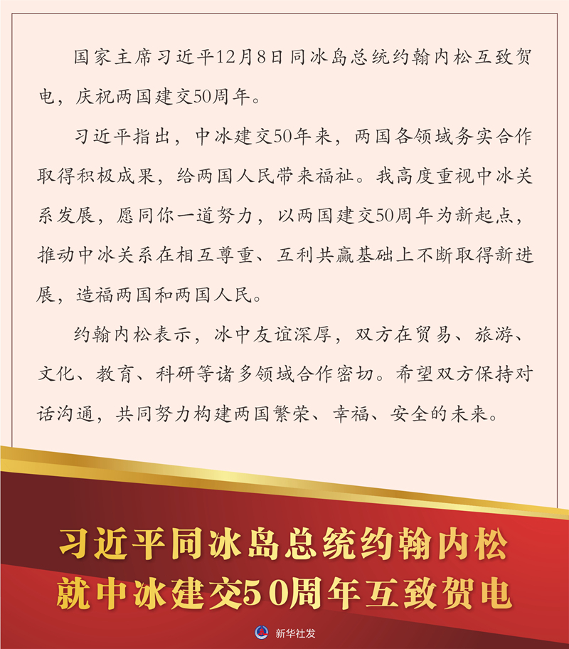新华社北京12月8日电  国家主席习近平12月8日同冰岛总统约翰内松互致贺电,庆祝两国建交50周年。