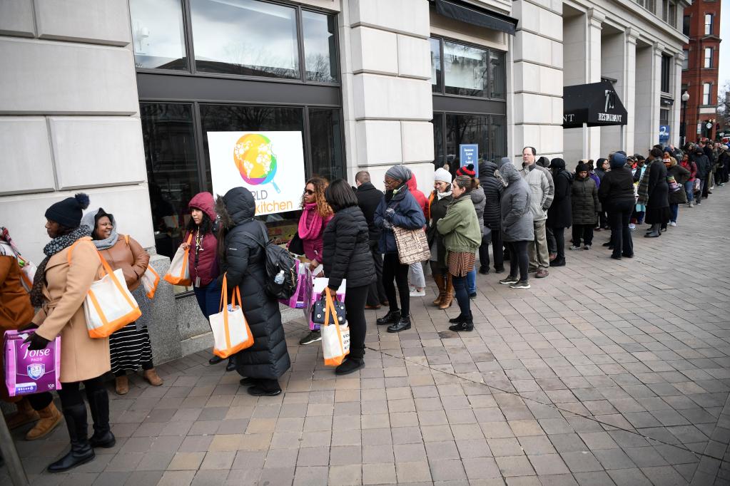 2019年1月23日,在美国首都华盛顿,一些联邦政府雇员在一家公益组织的“应急食堂”外排队领取免费餐。截至当日,从2018年底开始的联邦政府部分机构“停摆”已持续33天,约80万政府雇员这期间已错过一次工资发放,很多人手头越来越拮据,到期账单越积越多,不得不寻求外界帮助。(新华社记者刘杰摄)