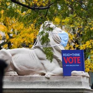 2020年11月2日,行人经过美国纽约公立图书馆外鼓励投票的广告。新华社记者王迎摄)