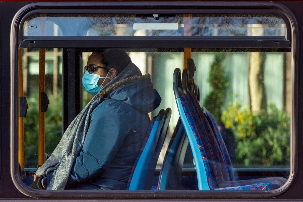 12月9日,戴口罩的乘客在英国伦敦乘坐公交车。(新华社发,史蒂芬·程摄)