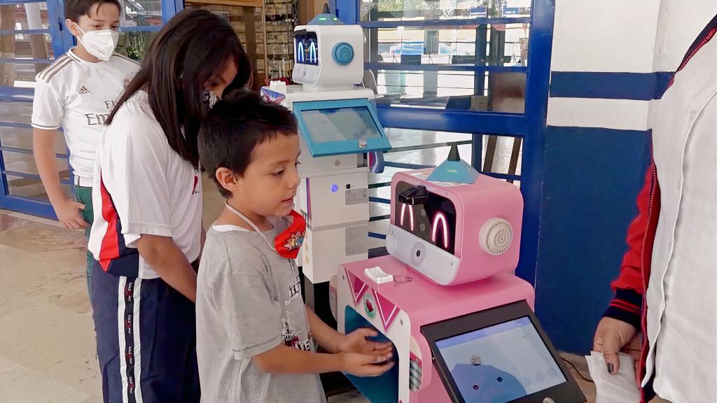 6月1日,在墨西哥中部克雷塔罗州一所学校,智能晨检机器人帮助学生在疫情期间返校。(视频截图)