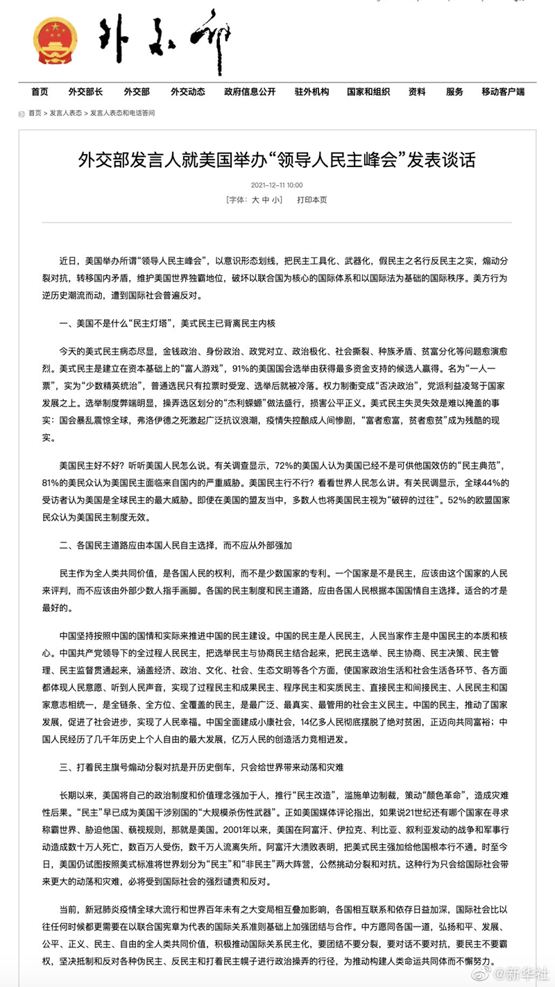 12月11日,外交部发言人就美国举办“领导人民主峰会”发表谈话。