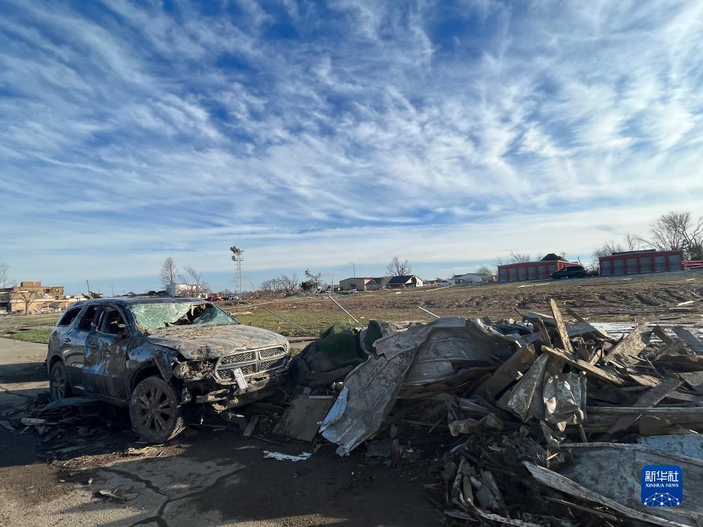 12月11日,在美国肯塔基州梅菲尔德,一辆汽车在龙卷风袭击中损毁。