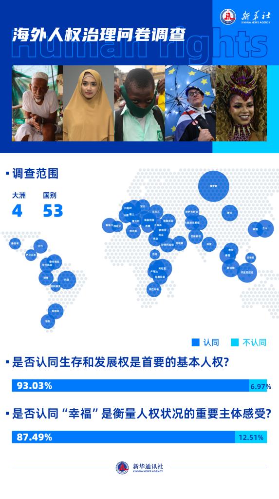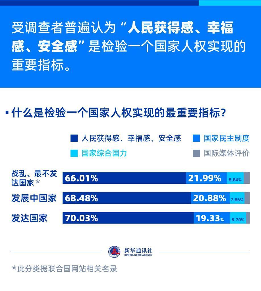 新华社近期进行的海外人权治理问卷调查显示,近70%的受访者有普遍共识,认为一个国家人权状况如何,普通民众的获得感、安全感、幸福感是重要指标。