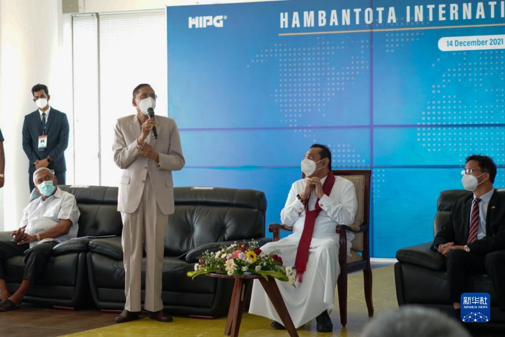12月14日,在斯里兰卡南部的汉班托塔港,斯里兰卡外长佩里斯(右三)代表斯方致辞。