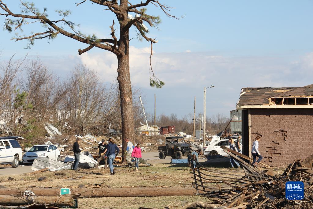 新华社报道员14日在位于肯塔基州西南部受灾严重的梅菲尔德市看到,救援人员正在修理市中心的银行屋顶、清理受损房屋的瓦砾垃圾。在居民区,所有危房均做了标记,房屋住户由公司或州政府出资安置到酒店居住。还有志愿者和非政府组织在市区街道搭起摊位,免费发放食物和饮用水。