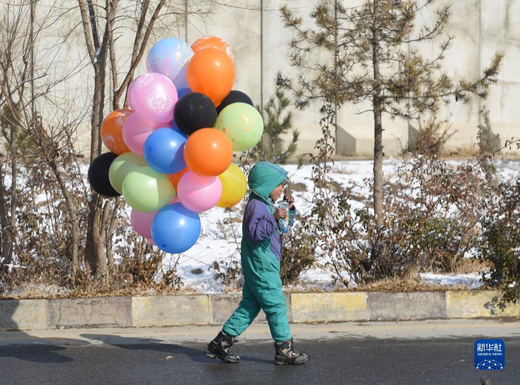 12月16日,一名男孩在雪后的阿富汗喀布尔街头售卖气球。新华社发(塞夫拉赫曼·萨菲摄)
