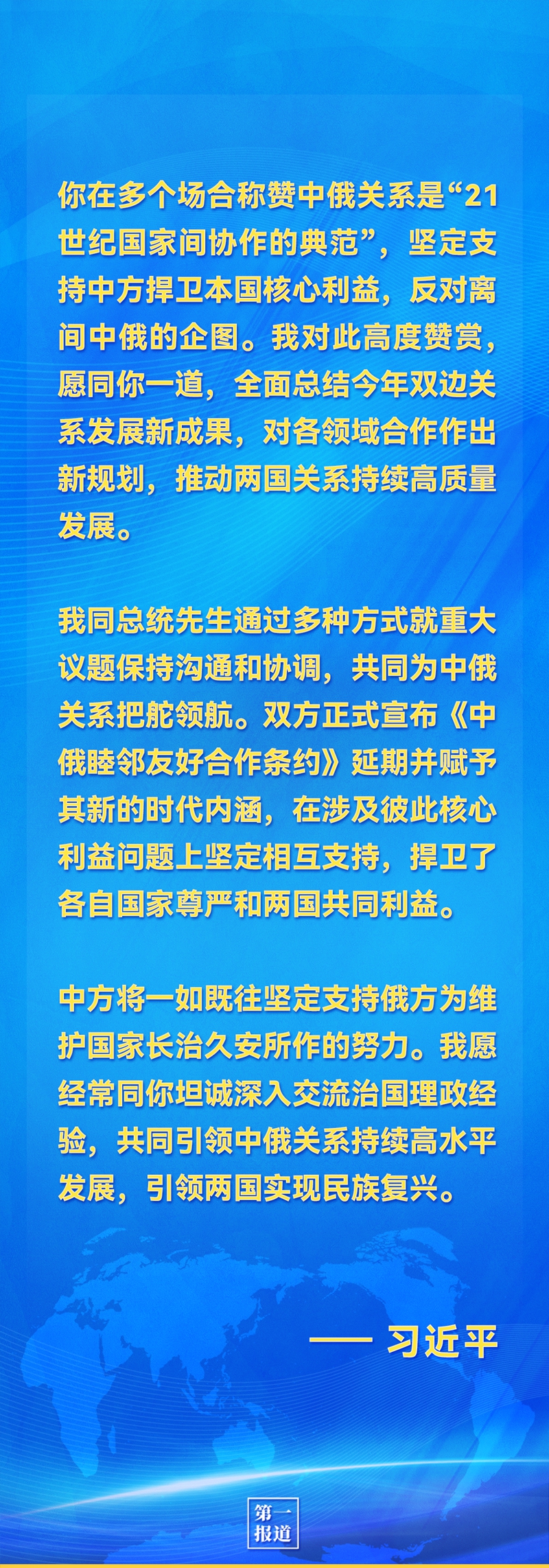 习近平强调,当前,世界百年变局和世纪疫情交织影响,世界进入动荡变革期。中俄关系经受住各种风浪考验,展示出新的生机活力。我同总统先生通过多种方式就重大议题保持沟通和协调,共同为中俄关系把舵领航。双方正式宣布《中俄睦邻友好合作条约》延期并赋予其新的时代内涵,在涉及彼此核心利益问题上坚定相互支持,捍卫了各自国家尊严和两国共同利益。