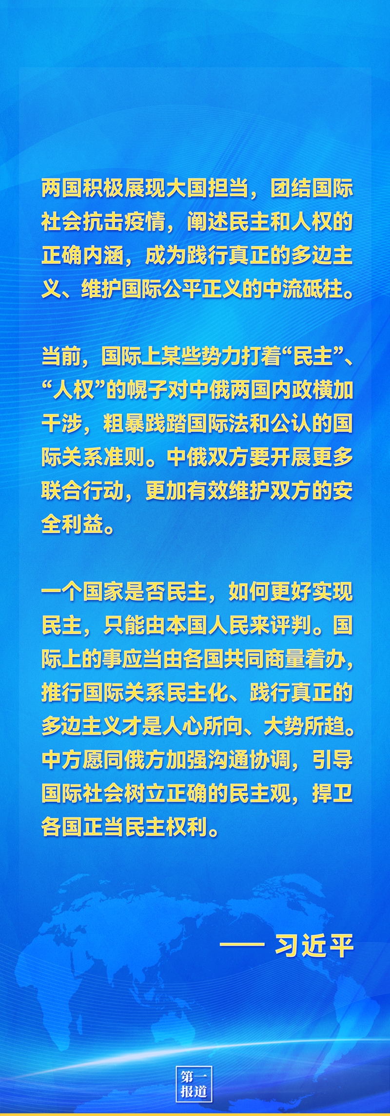 双方就当前大国关系和民主问题交换意见。习近平强调,民主是全人类的美好追求和共同价值,也是各国人民的权利。一个国家是否民主,如何更好实现民主,只能由本国人民来评判。国际上的事应当由各国共同商量着办,推行国际关系民主化、践行真正的多边主义才是人心所向、大势所趋。中方愿同俄方加强沟通协调,引导国际社会树立正确的民主观,捍卫各国正当民主权利。