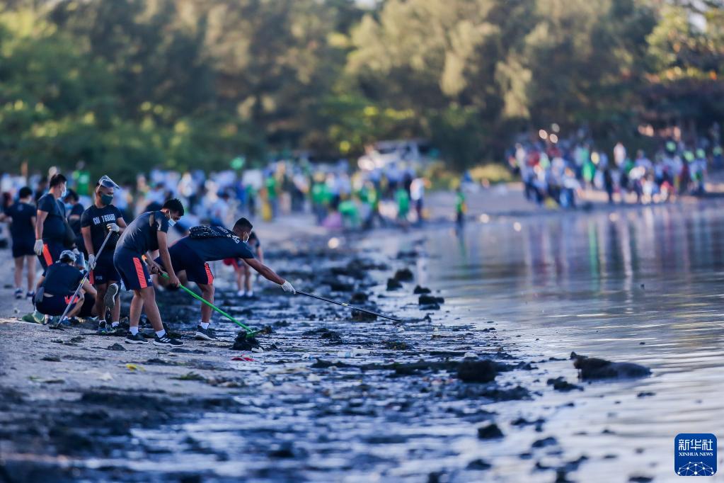 3月3日,人们在菲律宾拉斯皮尼亚斯清理海滩。
