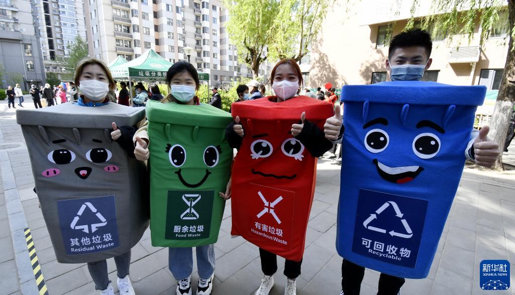 4月17日,垃圾分类志愿者在北京市朝阳区望京街道金隅丽港城社区参加垃圾分类宣传活动。