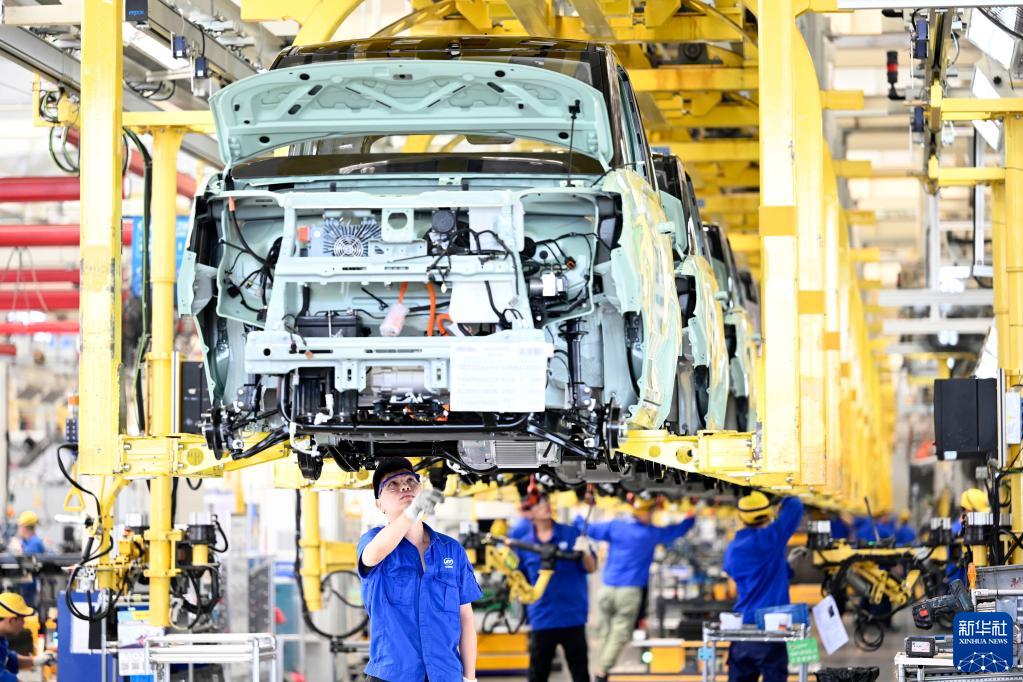 8月12日,工人在广西柳州一家汽车企业的新能源汽车生产线上忙碌。