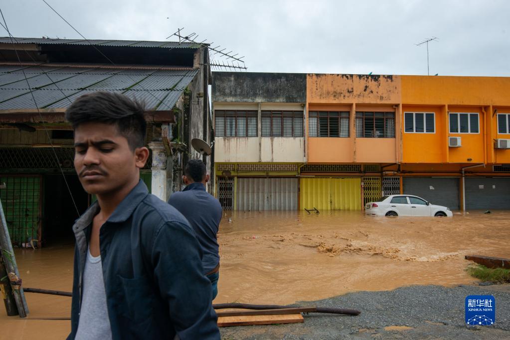12月19日,在马来西亚雪兰莪州乌鲁冷岳,当地居民站在被洪水淹没的道路旁。