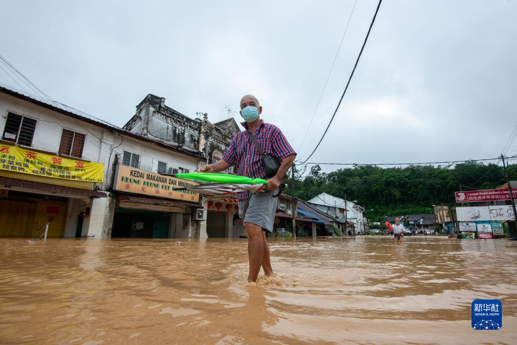 12月19日,在马来西亚雪兰莪州乌鲁冷岳,当地居民走在被洪水淹没的街道上。