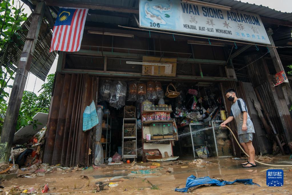 12月19日,在马来西亚雪兰莪州乌鲁冷岳,一名当地居民清理被水淹的店铺。