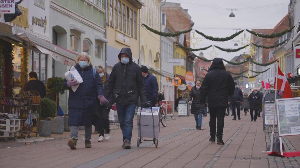 12月7日,丹麦首都哥本哈根,人们在一条步行商业街上购物。(视频截图)