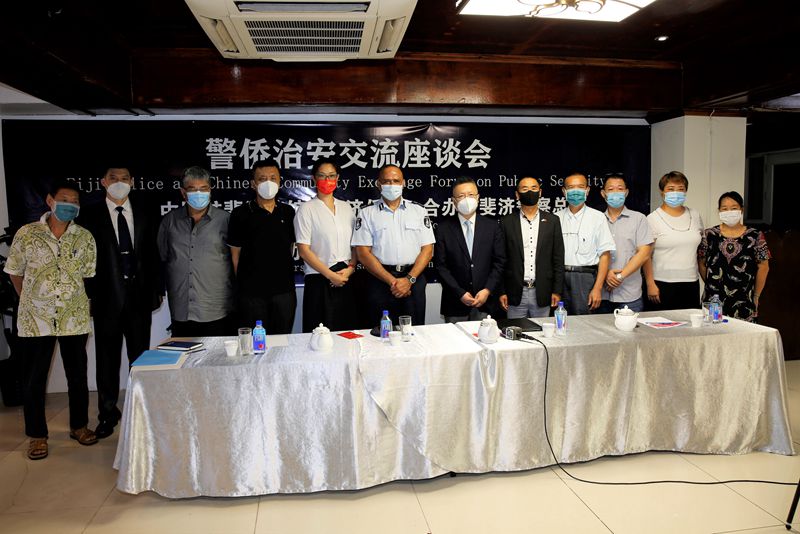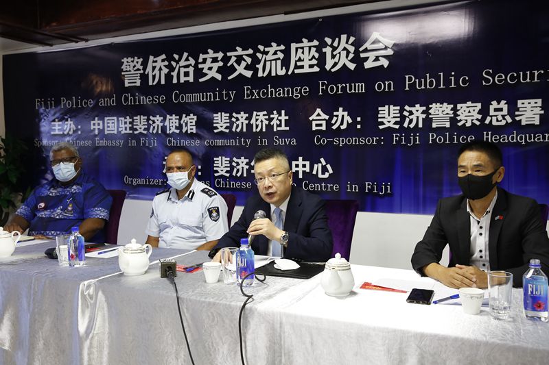 新华网苏瓦12月23日电(记者张永兴)中国驻斐济大使馆21日携手斐济警察总署及斐济华人社团,在首都苏瓦举办警侨治安交流座谈会。中国驻斐济大使钱波出席活动并讲话。斐济警察总监恩吉里奥及斐警方高层官员、斐济华助中心主任赵福刚、中国驻斐济使馆警务联络官鹿凌振、使馆领保志愿者及侨社代表约百人参会。