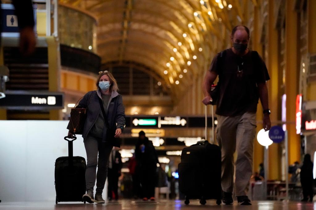 11月8日,在美国弗吉尼亚州阿灵顿的里根国家机场,旅客戴着口罩走在航站楼里。(新华社发,沈霆 摄)