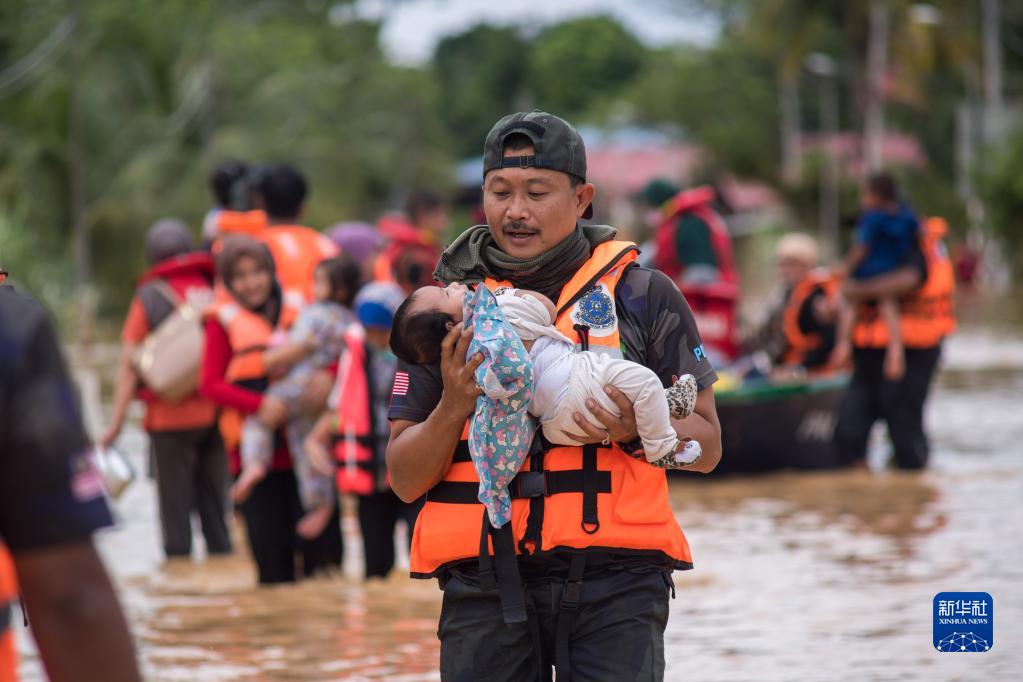 12月19日,在马来西亚雪兰莪州乌鲁冷岳,救援人员转移受洪水围困的儿童。