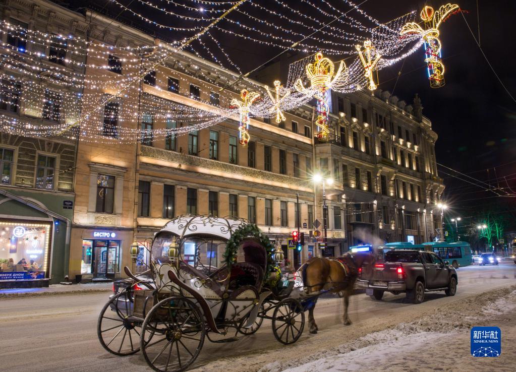 新年即将到来,俄罗斯圣彼得堡街头点亮各色灯饰,营造节日气氛。