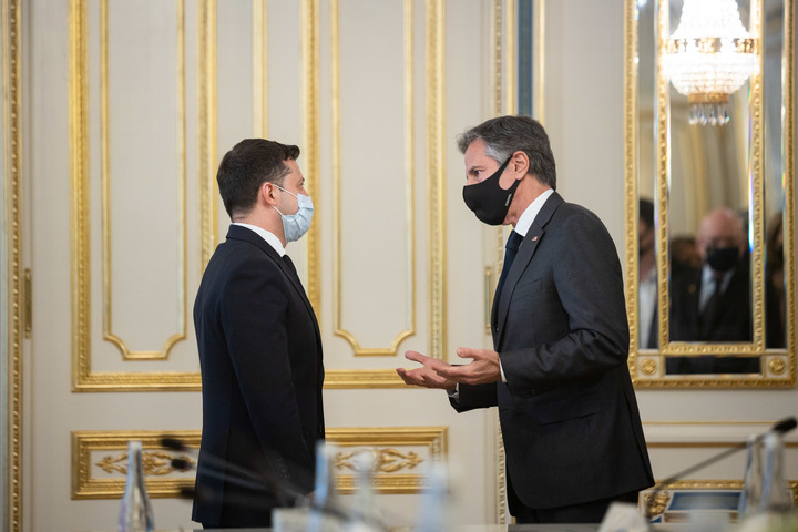 5月6日,乌克兰总统泽连斯基(左)在基辅会见美国国务卿布林肯。新华社发(乌克兰总统办公室供图)