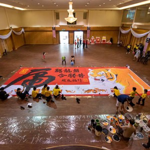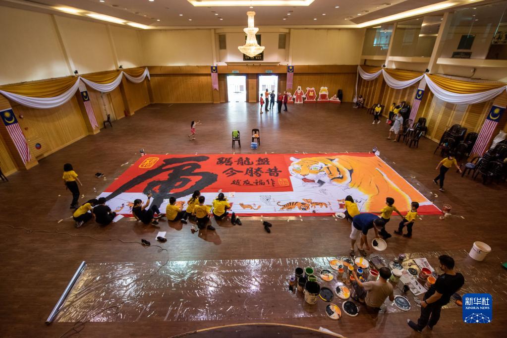 为迎接农历虎年的到来,文冬当地一家华人团体邀请画家和学生一起创作了一幅11.5米长、4.5米宽的老虎年画。新华社发(张纹综摄)