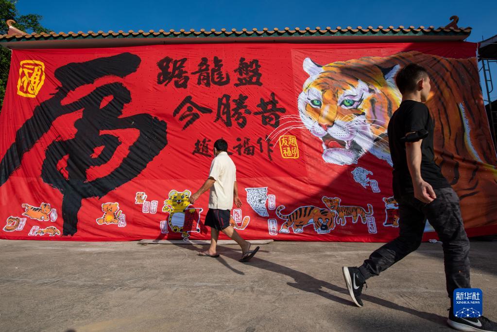 为迎接农历虎年的到来,文冬当地一家华人团体邀请画家和学生一起创作了一幅11.5米长、4.5米宽的老虎年画。新华社发(张纹综摄)