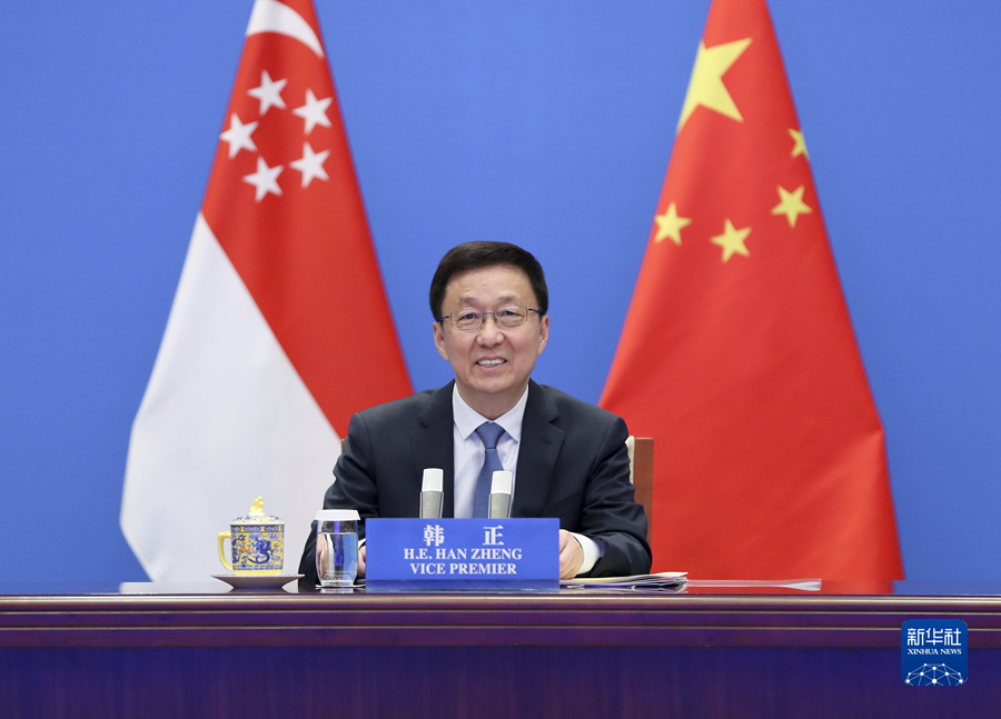 会见时,韩正表示,中新作为近邻和伙伴,政治上相知互信,高层交往密切。习近平主席不久前同李显龙总理通电话,对中新关系发展作出新的战略指引。中方欢迎新方深度参与中国构建新发展格局进程,愿同新方携手同行,深入开展高质量共建“一带一路”合作,共同维护多边主义和自由贸易,加强新冠疫苗和药物研发生产等抗疫合作,积极拓展数字经济、绿色发展等领域合作,推动两国合作不断提升质量和水平。