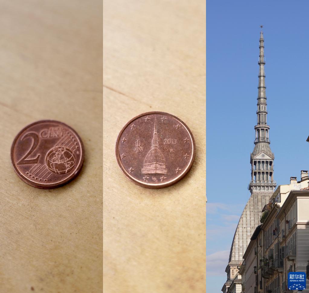 拼版照片:左图为2021年12月30日在意大利罗马拍摄的由意大利发行的2欧分硬币正面;中图为2021年12月30日在意大利罗马拍摄的由意大利发行的2欧分硬币背面,印有安托内利尖塔图案;右图为2021年11月8日在意大利都灵拍摄的安托内利尖塔。