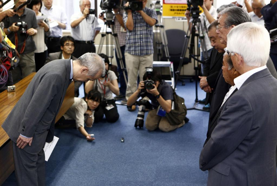2013年8月29日,在日本东京,日本东京电力公司社长广濑直己(左)向全国渔业协会联合会的代表鞠躬道歉。日本福岛第一核电站先前曝出储水罐放射性污水大量泄漏事件,引发日本渔业团体担忧和抗议。新华社/法新