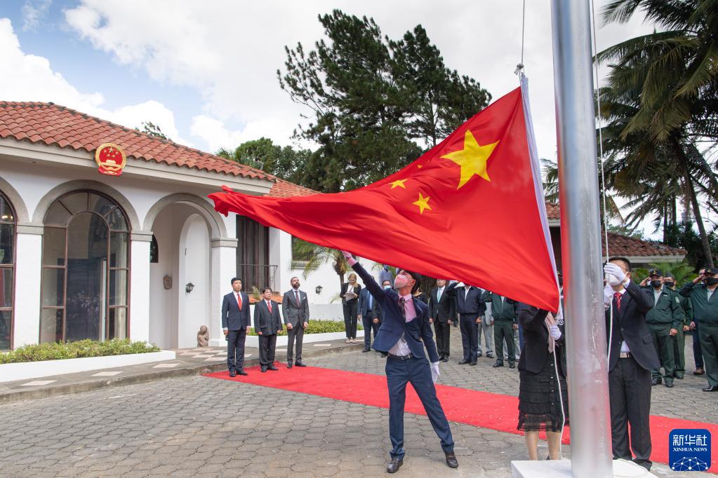2021年12月31日,在尼加拉瓜马那瓜举行的中国驻尼加拉瓜大使馆复馆仪式上,五星红旗伴随着《义勇军进行曲》冉冉升起。当地时间2021年12月31日中午,中国驻尼加拉瓜大使馆复馆仪式在尼首都马那瓜举行。新华社记者 辛悦卫 摄