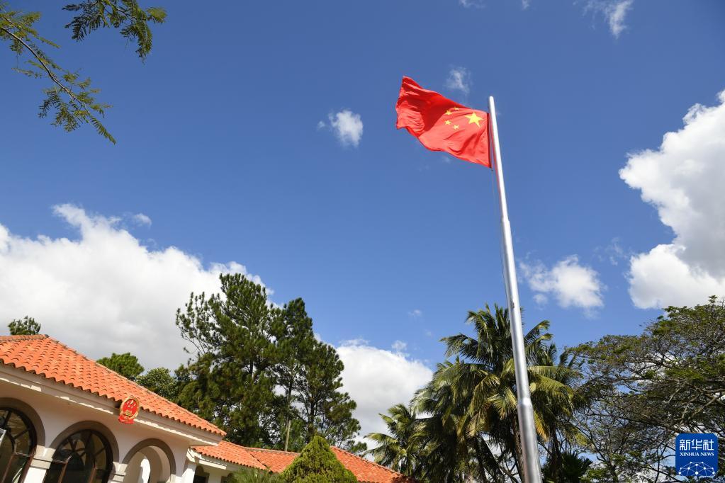 2021年12月31日,在尼加拉瓜马那瓜的中国驻尼加拉瓜大使馆,五星红旗在空中飘扬。 新华社记者 辛悦卫 摄