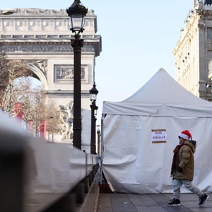 2021年12月23日,一名儿童走过法国巴黎凯旋门附近的一处新冠病毒检测点。新华社记者高静摄