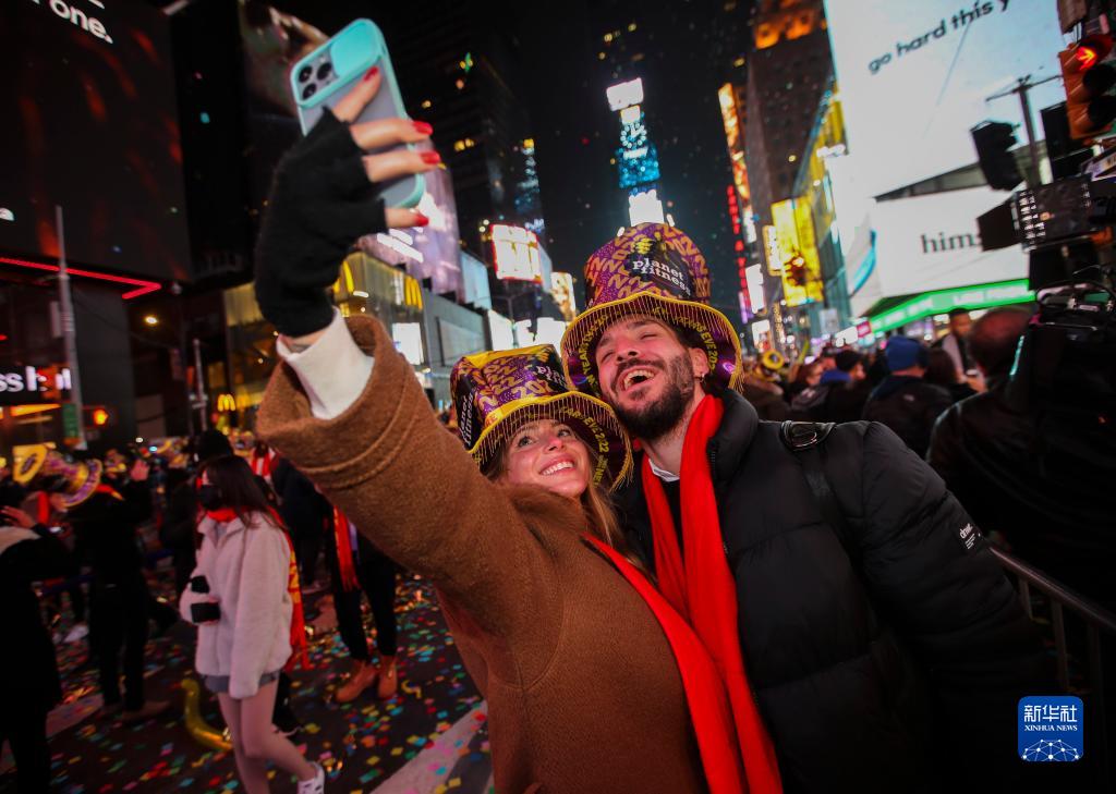 2022年1月1日,人们在美国纽约时报广场迎接新年。