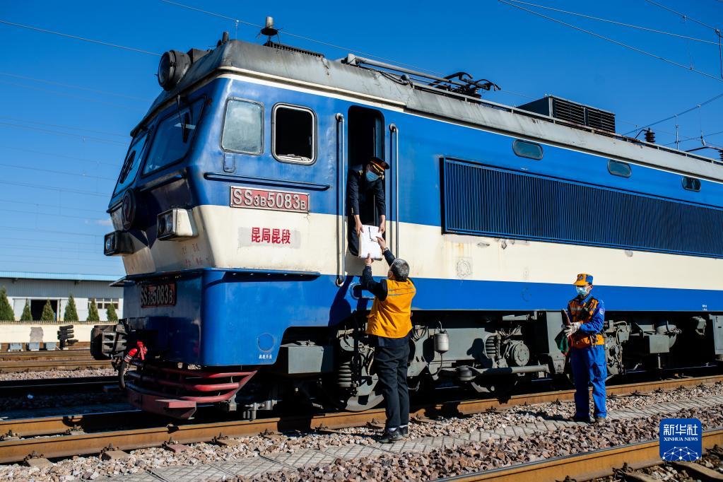 2022年1月1日,在昆明王家营西站,铁路工作人员交换行车文件。新华社记者胡超 摄