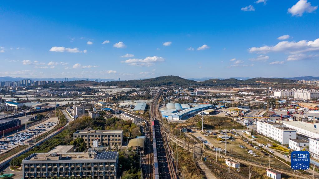 2022年1月1日,满载30个标准集装箱的中老铁路新年首趟国际货物列车从中铁联集昆明中心站开往王家营西站更换电力机车(无人机照片)。新华社记者胡超 摄