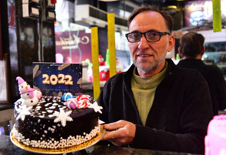 2021年12月30日,在叙利亚首都大马士革,一个男子手捧新年蛋糕。(阿马尔·萨法尔贾拉尼摄)
