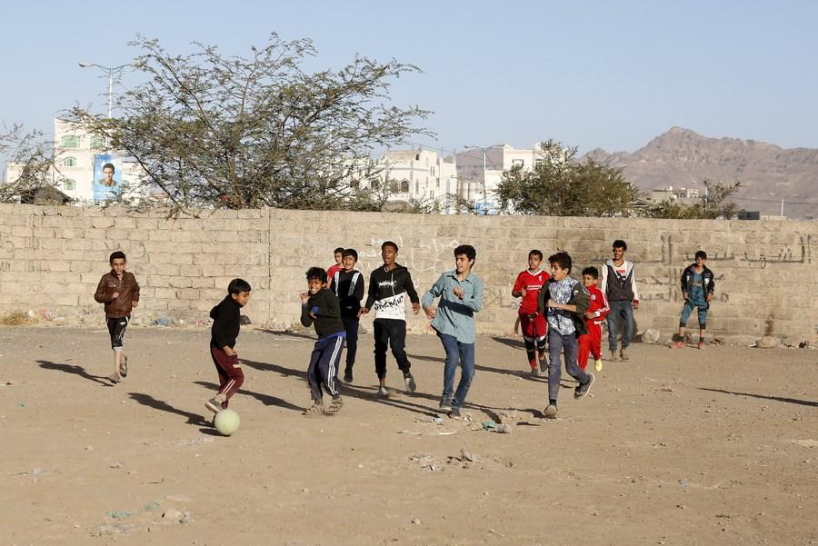 2021年12月29日,一群也门儿童在首都萨那的一块空地上踢足球。(默罕默德摄)