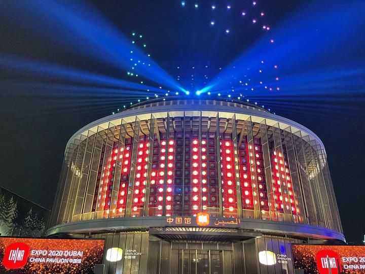 这是2021年10月4日在阿拉伯联合酋长国迪拜拍摄的迪拜世博会中国馆大型主题灯光秀。新华社记者苏小坡摄