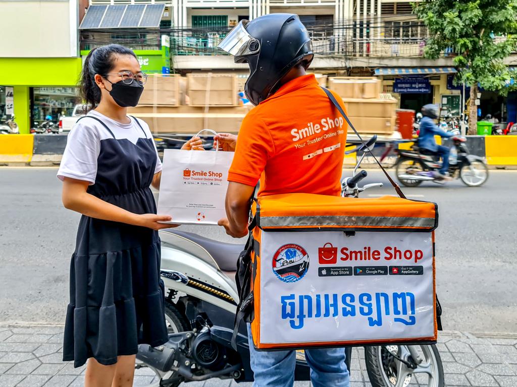 2021年12月21日,柬埔寨电子商务平台“微笑商城”的配送人员在首都金边送货。(新华社记者吴长伟摄)