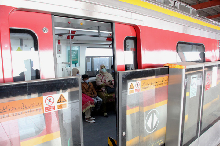 2021年12月29日,在巴基斯坦拉合尔,人们坐在橙线地铁车厢内。新华社发(贾米勒·艾哈迈德摄)