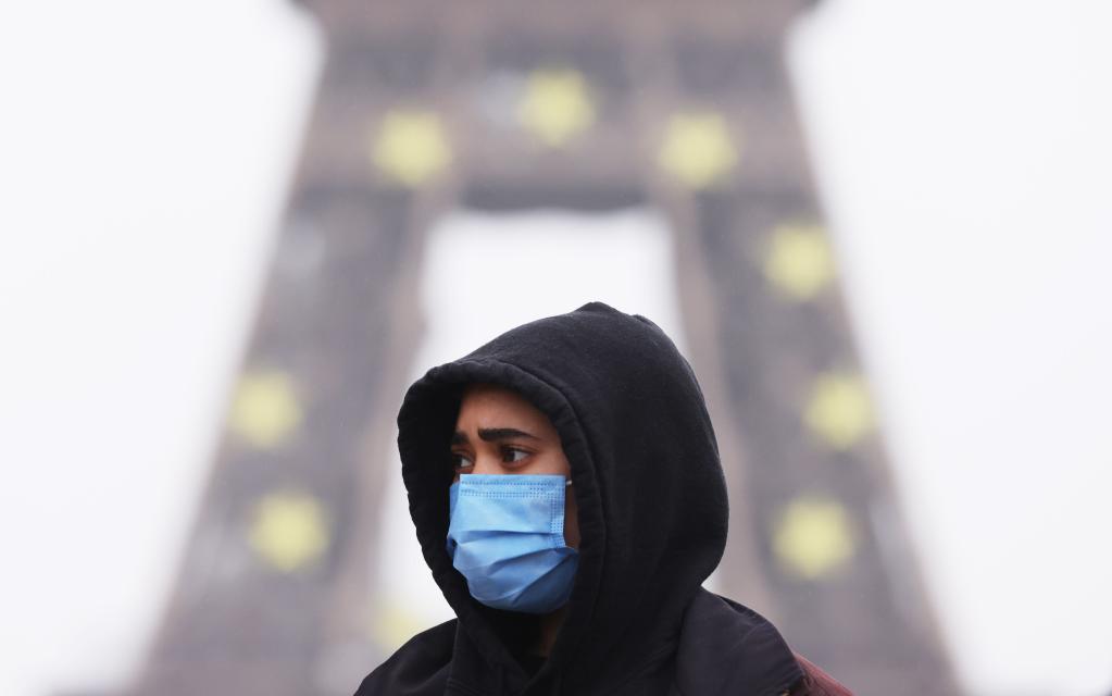 2021年12月29日,一名戴口罩的行人走过法国巴黎埃菲尔铁塔附近的特罗卡德罗广场。新华社记者高静摄