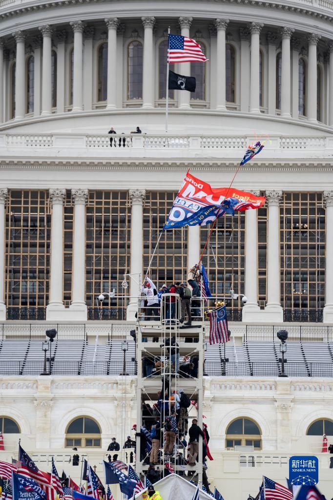 2021年1月6日,特朗普支持者在美国首都华盛顿的国会大厦前举行示威时占据下届总统就职典礼的媒体拍摄高台。当日,大批支持时任美国总统特朗普的示威者强行闯入美国国会大厦,与警方发生冲突,造成5人死亡多人受伤。